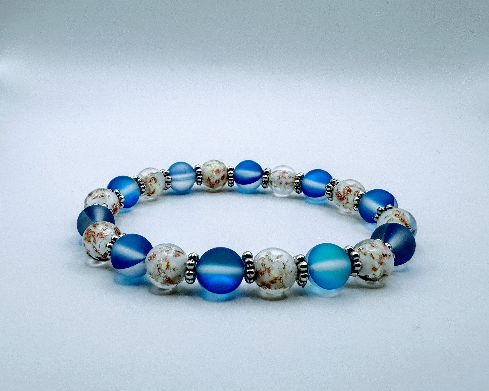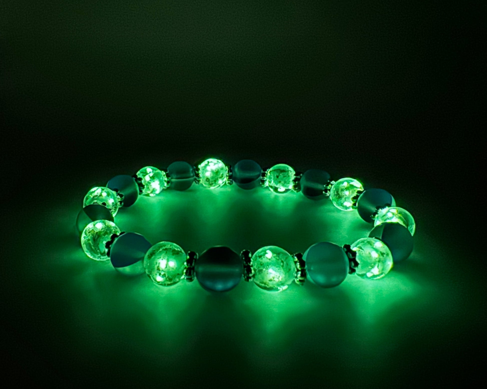 This stunning bracelet features a striking combination of 8mm white glow-in-the-dark glass beads and vibrant blue Aurora Borealis beads. The white glass beads have a sleek, polished finish that absorbs light during the day and emits a soft glow at night, creating an enchanting effect. The blue Aurora Borealis beads shimmer with iridescent hues, reflecting light in a mesmerizing spectrum of colors, from deep blue to shimmering aqua.