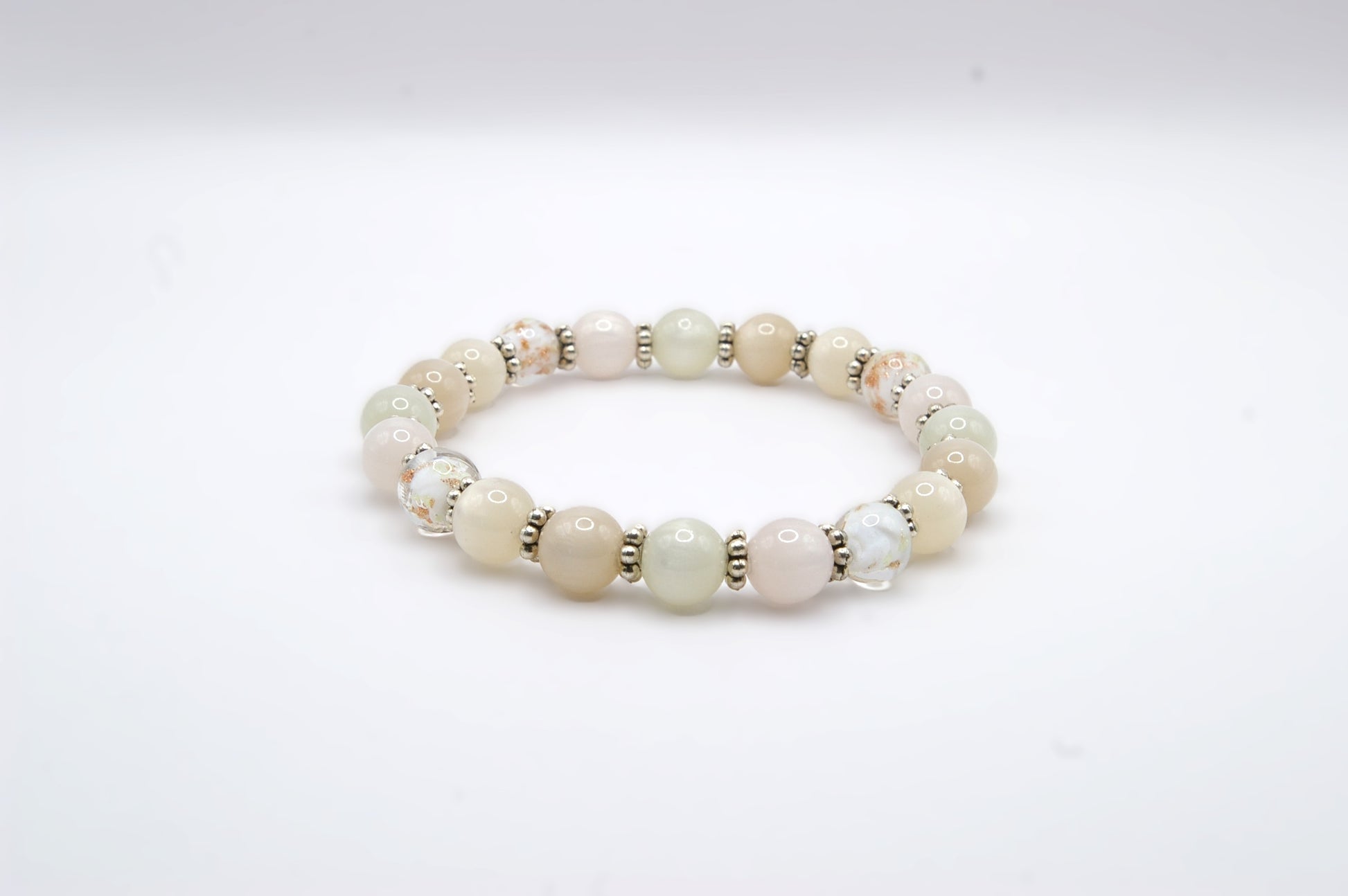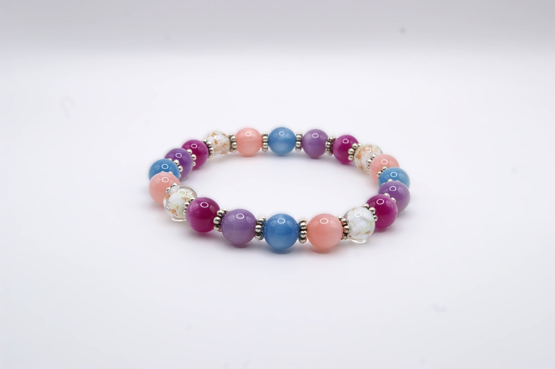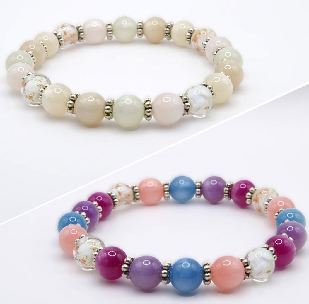 The Celestial Glow Bracelet is a dazzling piece that captures the magic of the night sky and the wonders of the sun. Featuring white beads that shift colors in the sunlight, transforming into hues of pink, purple, blue, and peach, this bracelet mirrors the ever-changing beauty of the heavens. Paired with a special white bead that glows in the dark, it offers a mystical touch that shines brightly even after the sun sets!