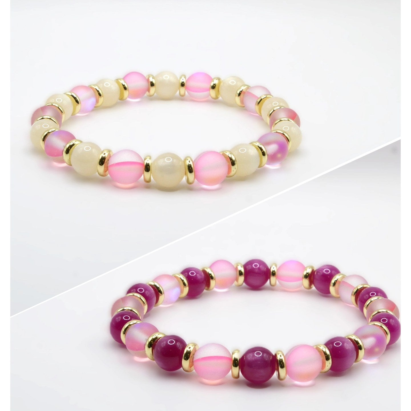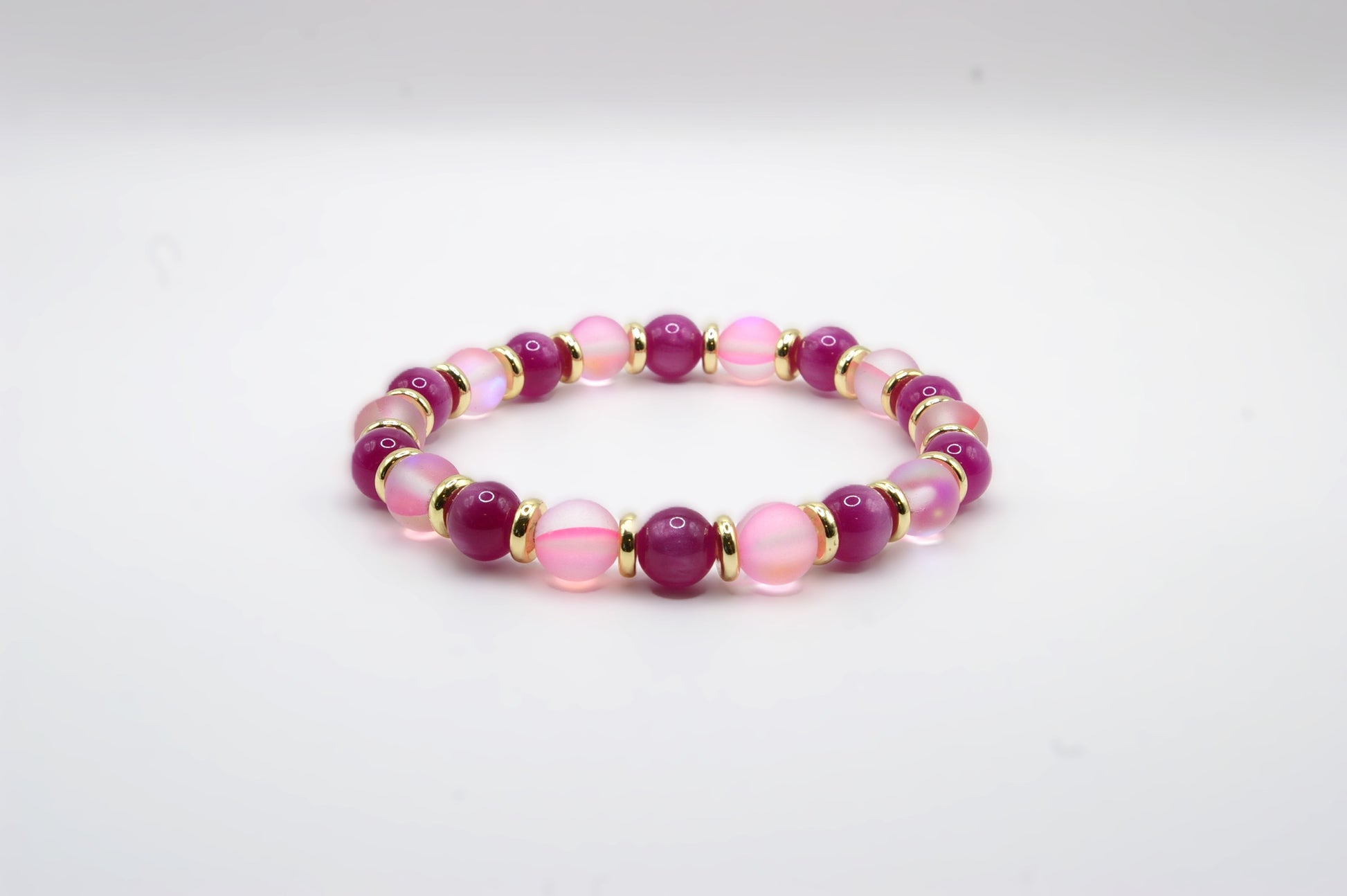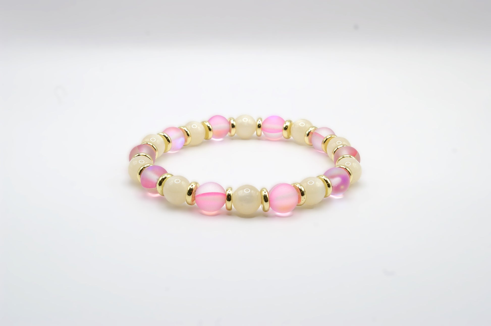 This bracelet is a whimsical and enchanting piece, designed to capture the delicate beauty of a fairy’s touch. Featuring white beads that transform into a soft, enchanting pink in the sunlight, this bracelet evokes a sense of magic and wonder. It is paired with a luminous pink bead that adds a soft, ethereal glow, creating a radiant contrast.